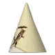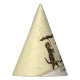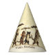 This personalised party hat has four brown and white striped cats walking upright in the snow carrying umbrellas on a pale yellow background. Customise the Happy Birthday text with the template.