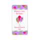 Whimsical birthday mini wine labels, with pretty graphics, on the top and bottom, of pink and green polka dots, on a lavender background, edged by a silver tone ribbon. Three colourful balloons decorate the middle and fun pink text, on the top and bottom is ready to personalise for your special event.