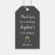 A chic black birthday thank you tag with elegant white script and gold champagne glasses illustration. Ideal for milestone birthday parties or classy celebrations with a modern touch.