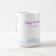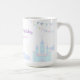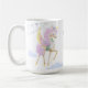 Birthday Coffee Mug with an adorable unicorn with wings, which is surrounded by cute pictures of a magical castle, clouds and festive bunting.