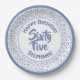 This over-the-hill design has a blue and white random number pattern with a blue milestone number 65 repeated in varied sizes and angles over a white background. There is a white circle in the centre for your text, and blue l and white rings around the rim.