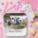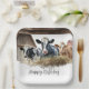 Three watercolor cows by barn feed trough filled with hay with text for birthday party.
