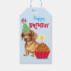Happy birthday greetings with this cute design featuring a smiling, party hat-wearing Dachshund puppy with a birthday cupcake.