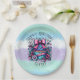 Graphics of a vanilla cupcake with purple and blue frosting with flowers and a bow. Purple, teal, blue and pink personalised birthday plates for a birthday party.