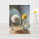 A glass vase holds a vibrant yellow dandelion while a mirror reflects its fluffy white seed head.