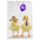 Cute fuzzy yellow duckling couple on a white background with a purple 65th birthday balloon.