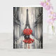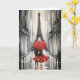Design features a romantic watercolor like black and white image of Paris with the Eiffel Tower in the background. In the foreground, an elegant couple in love holds a vibrant cute red umbrella. Gentle light illuminates the scene, casting romantic shadows.