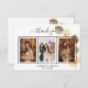 Add 3 of Your birthday photos, vertical size, a date, name, and the thank you note. A white background with black text and frame, a golden eucalyptus sprig. The text: Thank you on the front and your name on the back are written with a stylish hand lettered script with swashes.