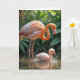 A vibrant scene features a tall flamingo standing beside its chick as it splashes in the water, surrounded by lush green foliage.