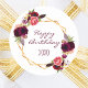 A chic white background with a faux gold geometric frame. Decorated with dark purple and burgundy flowers, roses and boho style feathers. Burgundy hand lettered style script and the text: Happy Birthday and xoxo (hugs and kisses)