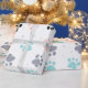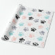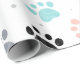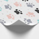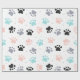 This design features pink blue and grey dog paw prints in a seamless pattern over a white background. This is perfect for wrapping dog birthday presents.