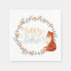 Watercolor design features red fox and floral wreath with "Happy Birthday" in modern script