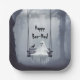 White ghost on a swing in a spooky misty forest with a raven for a Halloween birthday party.