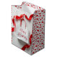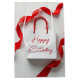 A white gift bag sits centrally on a light background, its vibrant red ribbon gracefully flowing around it, adding an elegant touch.