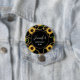 Birthday girl button with an elegant and stylish pattern. Pretty yellow sunflowers and green leaves surrounded by delicate gold chains. Black background.