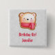 Birthday girl button with a cute and adorable bear face set on a cookie base. Wearing a red and white striped scarf.