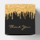 Elegant, classic, glamourous and girly for a 21st (or any age) birthday party favours. A chic black background colour. On the front and the back: The text: 21st Birthday and Thank You written with a modern hand lettered style script. Decorated with faux gold glitter drips, paint dripping look. Personalise and add a name and a date. Golden coloured text.