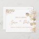 A girly and trendy Save the Date card for a 40th (or any age) birthday party. A stylish white background decorated with golden eucalyptus foliage and faux gold glitter dust. Personalise and add a date and name and text. Golden coloured letters. The text: Save the Date is written with a large trendy hand lettered style script.