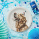 Cute cartoon illustration of Golden Retriever dog wearing a birthday hat. Perfect for pet lovers or dog parents.