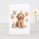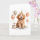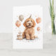 Cute cartoon illustration of Goldendoodle dog wearing a birthday hat with a birthday cake and balloons. Perfect for pet lovers or dog parents.