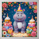 Birthday hippo with cake and balloons poster