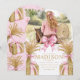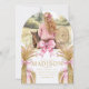 In the background, a sunlit countryside meadow with hay fields sets an open and airy atmosphere. The invitation is designed in delicate blush pink and warm brown tones, enriched with cherry blossom flowers, soft ribbons, bows, and subtle hay details that add a romantic and feminine touch.