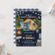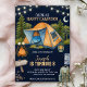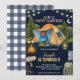 Birthday invitation featuring a camping theme. A tent sits under string lights with a crescent moon and pine trees. Text reads "Calling all happy campers! Joseph is turning 8." A campfire and lantern add warmth.