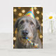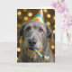An Irish Wolfhound dog wearing a colorful party hat and noisemaker against a gold bokeh background.
