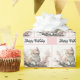 Watercolor artwork of a cute kitten in a garden on pink background with Happy Birthday text.