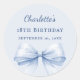 A light blue background color. Decorated with a large light blue colored bow. Personalize and add the name and date.