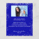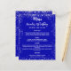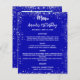 A royal blue background. White text. Decorated with faux silver glitter, sparkles.