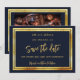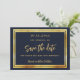 A classic navy blue background, decorated with faux gold frames. Large hand lettered script and the text: Save the Date. Personalise and add your photo, and details.