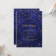 A glamourous birthday party invitation for both him and her. A navy blue background decorated with faux gold stars. The blue colour is uneven. Personalise and add a name and party details. Golden coloured text. A large age number as watermark.