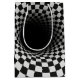 A tunnel-like optical illusion is created using a black and white chequered pattern, giving a dizzying sense of depth.