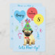 You're invited to a birthday Paw-ty with this smiling, party hat-wearing Pug puppy, surrounded by colourful balloons and streamers. Text can be easily personalised. Matching party supplies available.