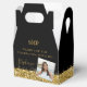 Elegant personalised photo party favour box with yellow gold glitter border and confetti sprinkles on a black background with custom thank you text, perfect for a modern and chic birthday, bat mitzvah, Quinceañera, bridal shower, baby shower or bachelorette party. Upload your own photo and use the Design Tool Template Editor to change the fonts, colours and layout to create a fun and unique personalised favour box for your party guests guests.