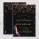 For an elegant 50th (or any age) birthday. A stylish black background. Decorated with purple faux gold glitter dust and a golden light strings, a purple stiletto shoe. Personalise and add a name, age and party details. The name is written with a hand lettered style script