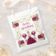 This birthday favour bag features an elegant gold frame, a beautiful princess with blonde hair and a burgundy red dress, flowers and a balloon. This is perfect for a birthday party.