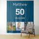 For a 50th (or any age) birthday party. A collage of 3 of your photos of himself friends, family, interest or pets. Personalise and add his name, age 50 and a date. Blue background. Date of birth or the date of the birthday party. White coloured text.