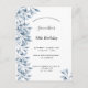 A modern and elegant birthday party invitation for a 50th (or any age) birthday party. A chic white background decorated with blue botanical sprigs, florals and foliage. The name is written with a trendy handlettered style script. Black text. Perfect for a winter, spring, summer or fall birthday celebration for both men, guys and for a woman.