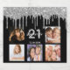 For a 21st (or any age) birthday party, celebrating her life with a collage of 5 of your own photos. Personalise and add a name, age 21 and a date. Date of birth or the date of the party. White and golden grey letters. Classic black background colour, decorated with faux silver glitter drips, paint dripping look.