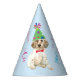 Happy birthday greetings with this cute design featuring a cute, party hat-wearing English Setter puppy surrounded by colourful streamers.