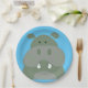 Birthday party fun hippo paper plate for the birthday table decoration. A cute decoration design for childrens party fun. The hippo would be great for a zoo theme party or if the child loves the hippo. The background is blue and the hippo in shades of green.