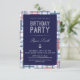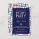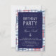 This stylish and preppy customisable birthday party invitation features a red, white and blue madras pattern background with a navy blue overlay. The text "Birthday Party" is in a silver faux "foil" style with a matching silver anchor. The text can be customised for your special birthday celebration.
