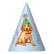 Happy birthday greetings with this cute design featuring a cute, party hat-wearing Irish Setter puppy surrounded by colorful streamers.