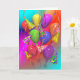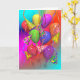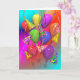 A colourful birthday greeting card with my 3d artwork of balloons, streamers and party hats. Text inside says "Happy Birthday!"