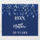 A label for a 50th (or any age) birthday party. A navy blue background with blue confetti. Personalise and add birth year, name and age. The name is written with an elegant hand lettered style script.