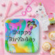 Funny people balloons with Happy Birthday text on pink, aqua, blue, green, orange, purple, and yellow fluid abstract design.