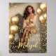 Birthday party welcome sign with photo and gold diamond confetti glitter and balloons