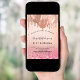 A rose gold and blush pink gradient background. Decorated with rose gold, pink faux glitter drips, paint dripping look and balloons. Personalise and add a name and party details. The name is written with a hand lettered style script.